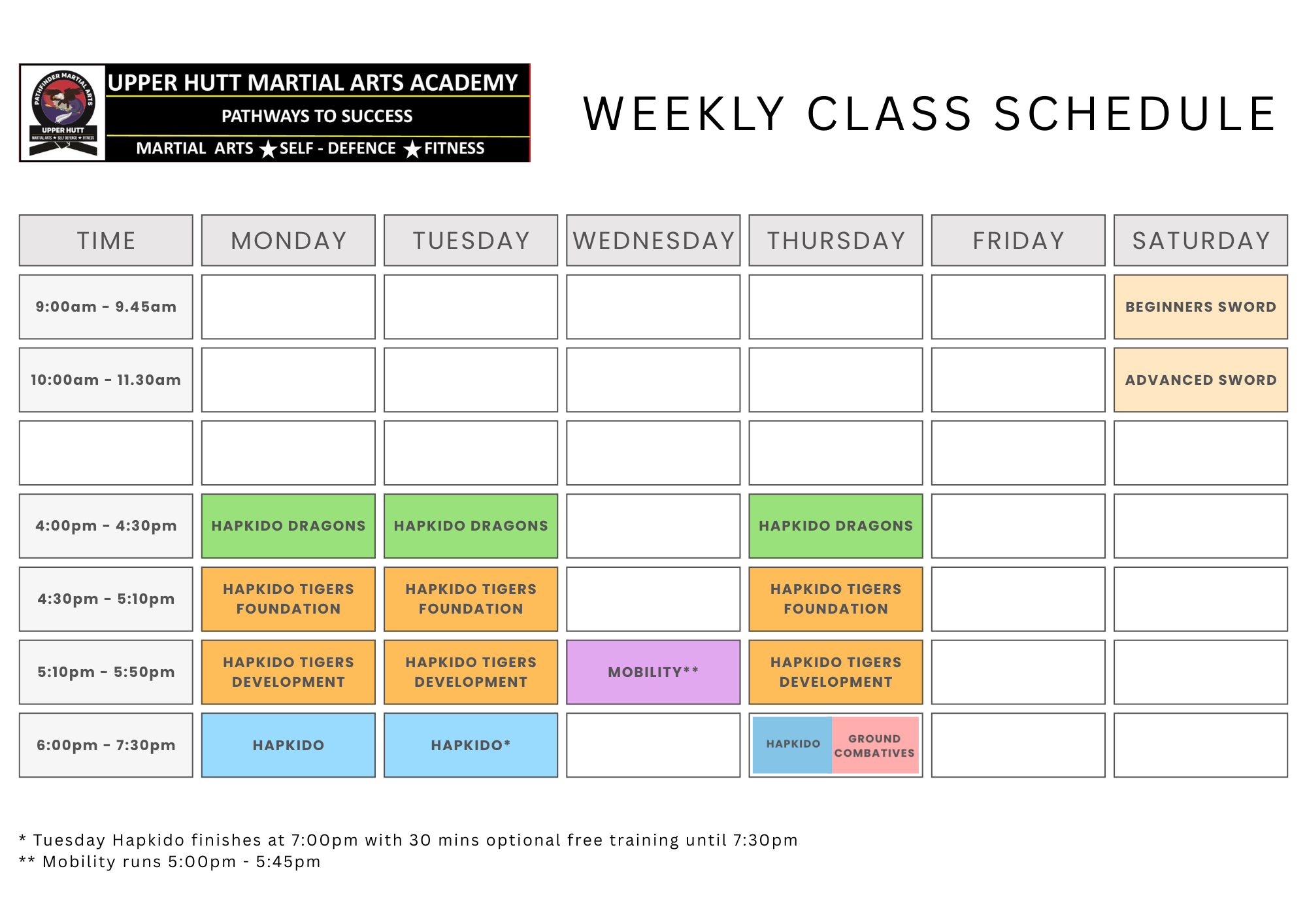 *Tuesday Hapkido finishes at 7 pm with 30 mins of optional free training until 7.30 pm